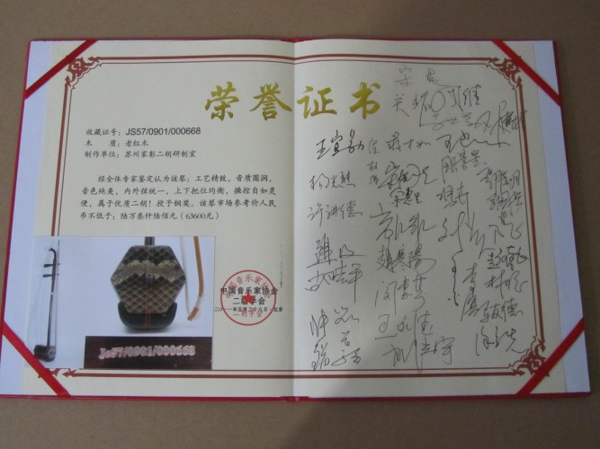 二胡制作大師丁家彭先生1949年出生樂器世家,17歲隨其祖父學琴藝,并深得精髓,其聰穎好學,悉心鉆研與 探求二胡制作,博得同行的欽佩贊許,更得了許多知名演奏家的稱贊,充分認識到二胡制作每個環節,都對二胡制作都有影響力,因此對二胡的選材,選料,蟒皮都十分嚴格,二胡整體穩定性良好,環境干擾影響極小。